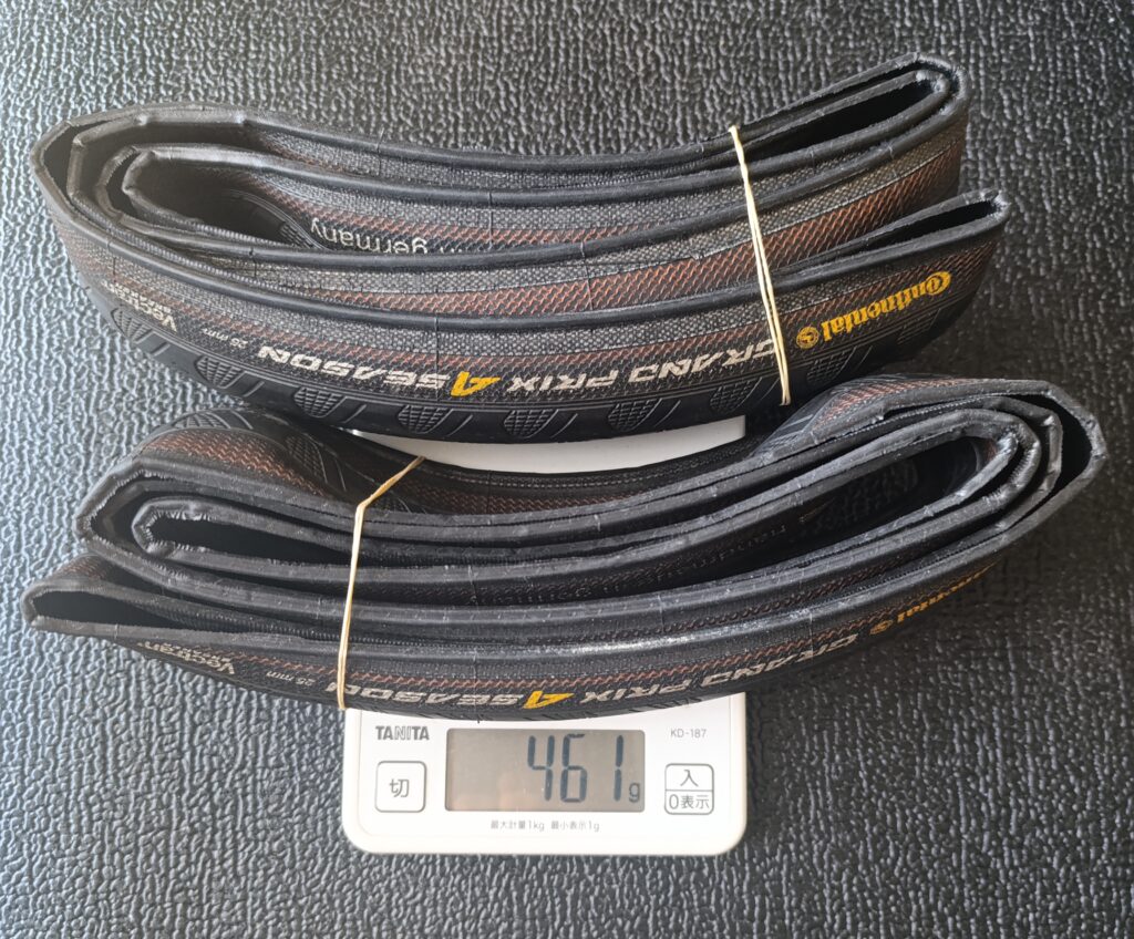 しかし、実際重さは同じ25cで約10gほどグランプリ5000のほうが軽く、転がり抵抗もグランプリ5000のほうがやや少ないようです。実際のところグランプリ5000も非常にパンクしにくいタイヤで、使った限りでは十分な耐パンク性能があると思いました。しかも、グランプリ5000もグランプリ4シーズンも耐久性があり寿命がとても長いです。簡単に言ってしまえばこの2つのタイヤはほぼ同じくらいの走行性能と耐久性があると言ってよいと思っています。
