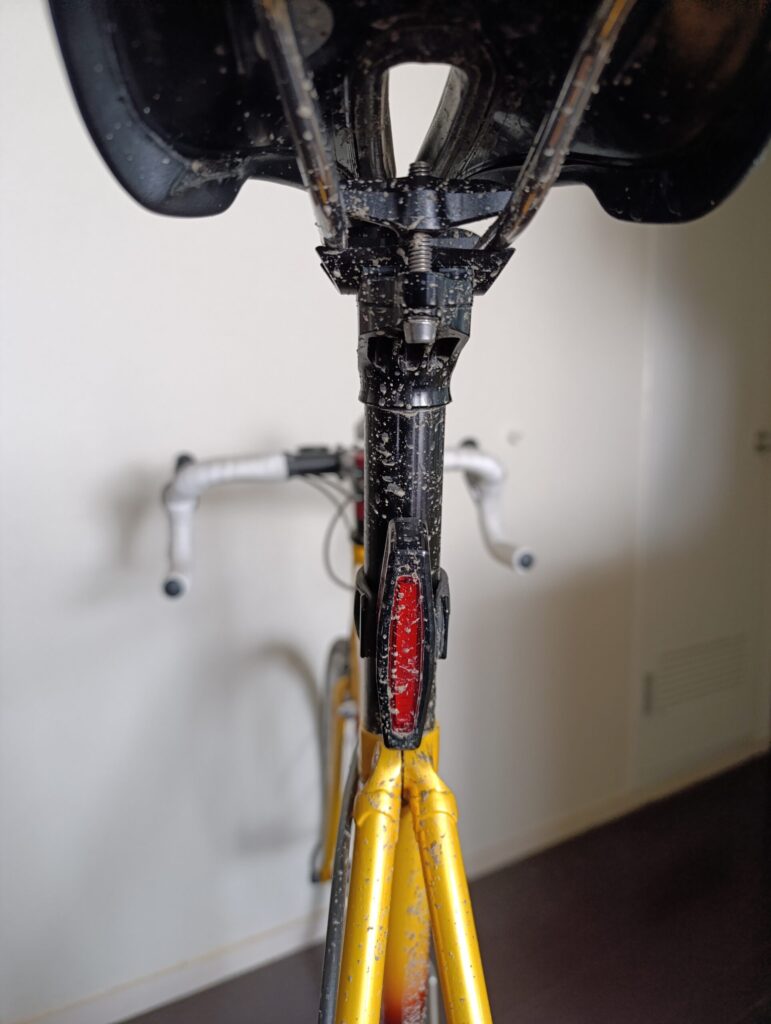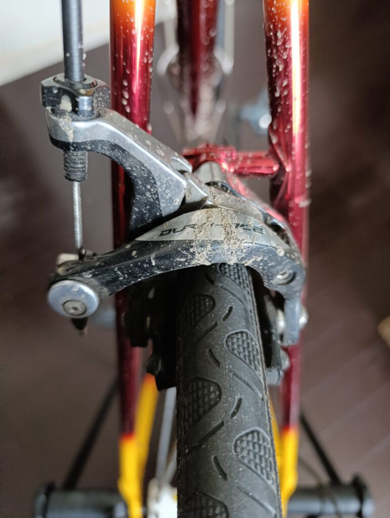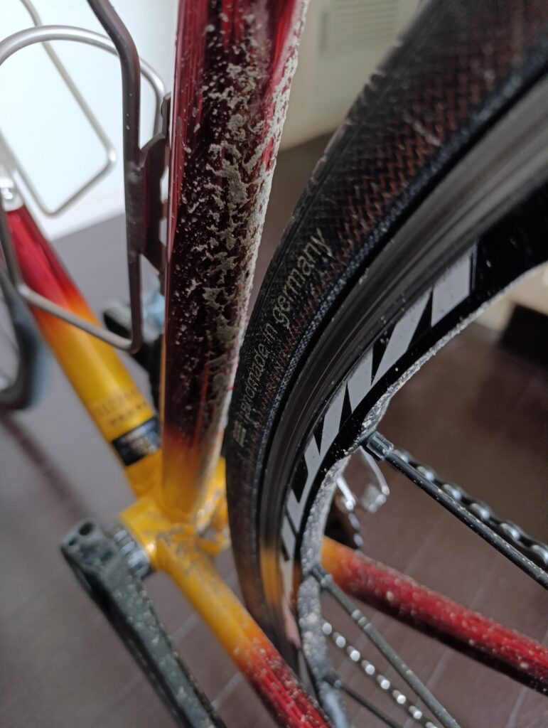 帰宅後私のバイクも泥まみれになっていることに気が付きましたあ。路面を覆う雪解け水が泥をはねてBB回りリヤブレーキ、シートチューブ、チェーンステー付近がリヤホイールの水撥ねをもろに受けてますね。ここまで汚れたのはこのバイクになってから初めてです。雪が降る地域で乗っている方はきっと春先の悩みなんでしょうね。イノシシのように泥まみれにはなりたくないものです。