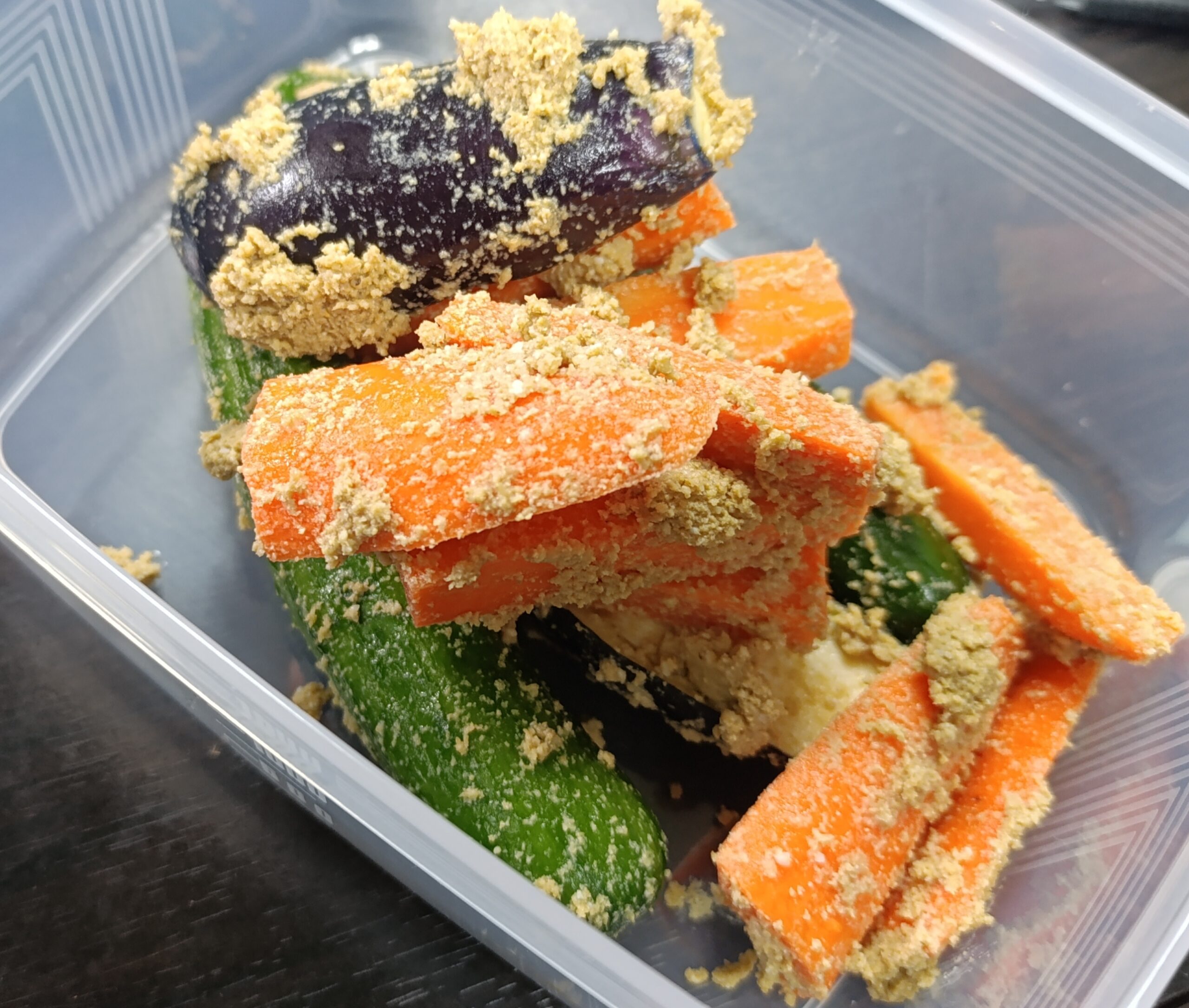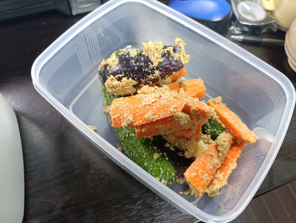 そこで、残った3分1ほどのぬか床は冷凍庫に保存しておきました。そうすれば帰省先から帰ってきたときにそのぬか床を使ってまたぬか漬けを作ることができます。
