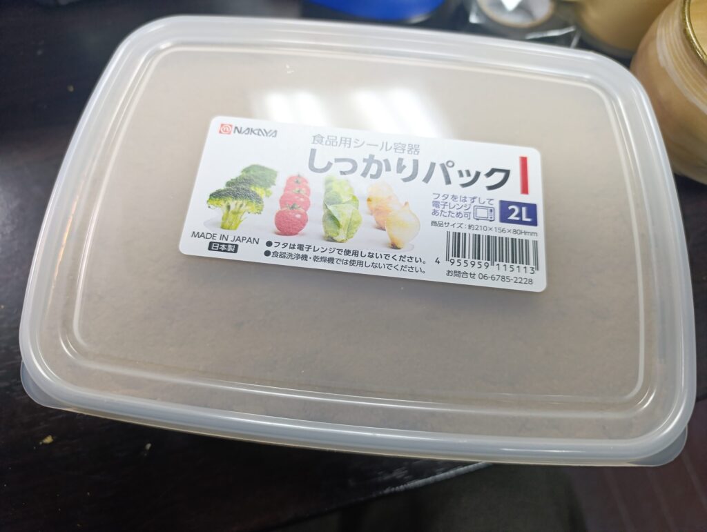 100円ショップで2リットル入りくらいのタッパーを購入します。これくらいのサイズがぬか漬け+糠床を入れてぬか漬けを作るのに適しています。
