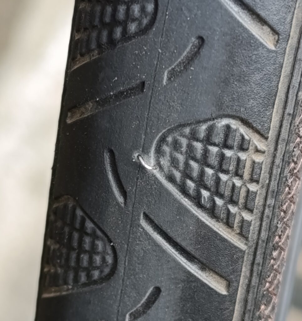 どこがパンクしたのかと思いタイヤ表面を見ると、探すまでもありませんでした。金属光沢が目に入ったので、すぐにパンク箇所だとわかりました。