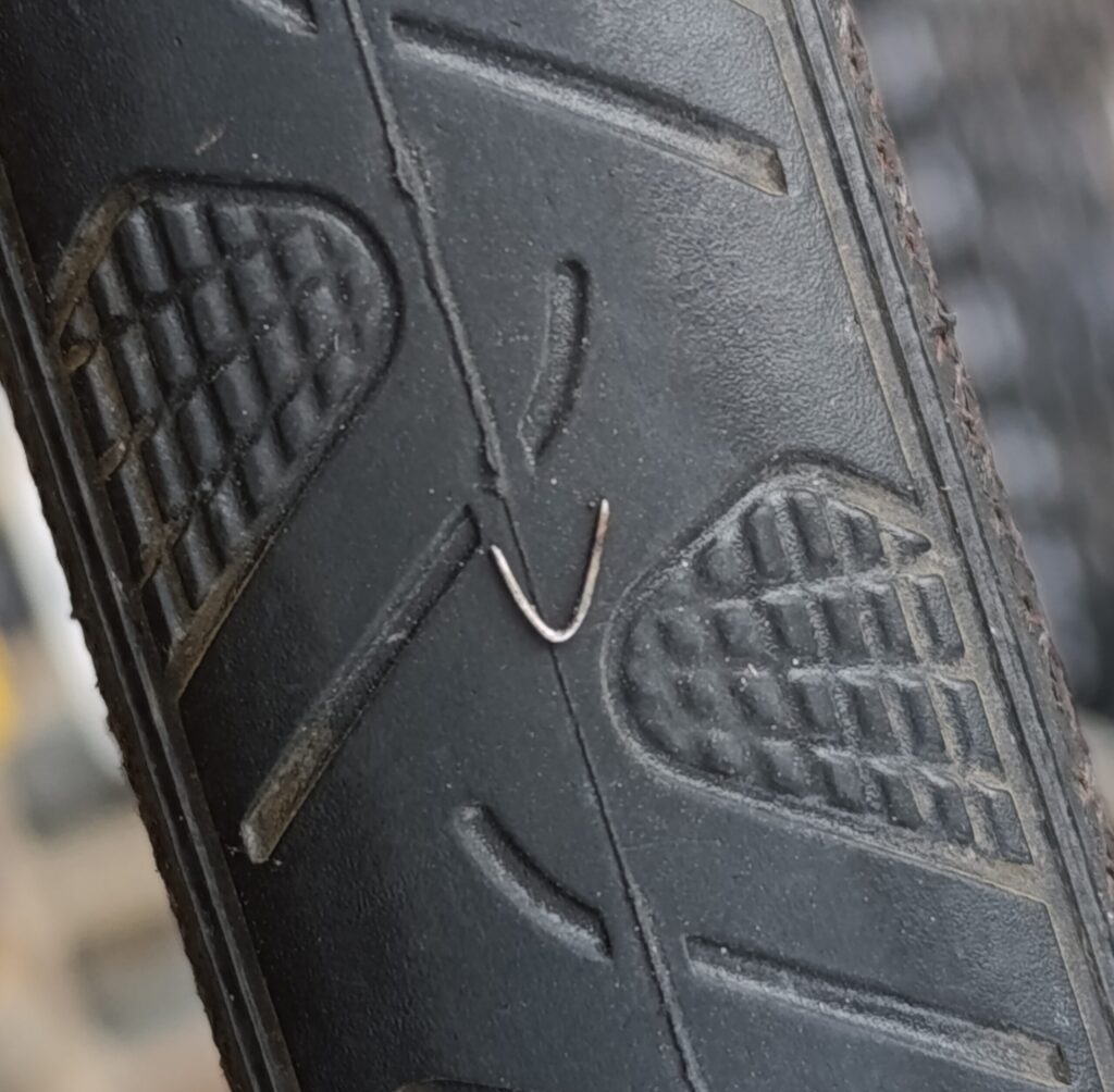 U字型のくさびになったものが刺さっていました。しかも針のように鋭い。さすがのグランプリ4シーズンも針2本がまっすぐ刺されば、これは防ぎきれないでしょうね。これはもう運が悪すぎるとしか言いようがありません。その昔、道路上に落ちていた鎌を踏んでスパッとタイヤを切られたときのことが思い出されました。ついてない時はこんなものです。