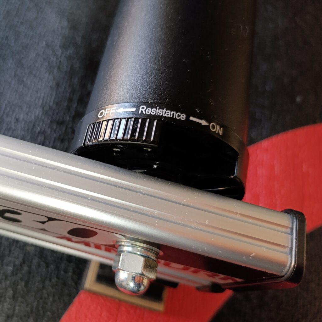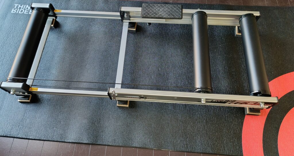 一番後ろのローラーの両サイドに負荷の切り替えレバーがついています。どちらか一方をオンにすると1段目の負荷が加わり、さらにもう一方をオンにすると2段目の負荷が加わるというシンプルなものです。3段階と言っても最初の負荷無し状態も含めて3段階なので実質2段階の負荷機能です。走行しながら負荷を変更できるわけでもない極めてアナログなつくりですが、私にとってはこれで十分です。もともと負荷をかけたトレーニングなどするつもりもなかったわけですが、負荷が加えられることにはありがたさを感じています。ペダリングの回転練習と低いレベルのペース走を室内でできればよいなあと思っていましたのでこれで十分です。さらに微妙な負荷を加えたければ手元のSTIレバーでギヤを選択すればそれで十分に室内でやりたいことはできると思っています。