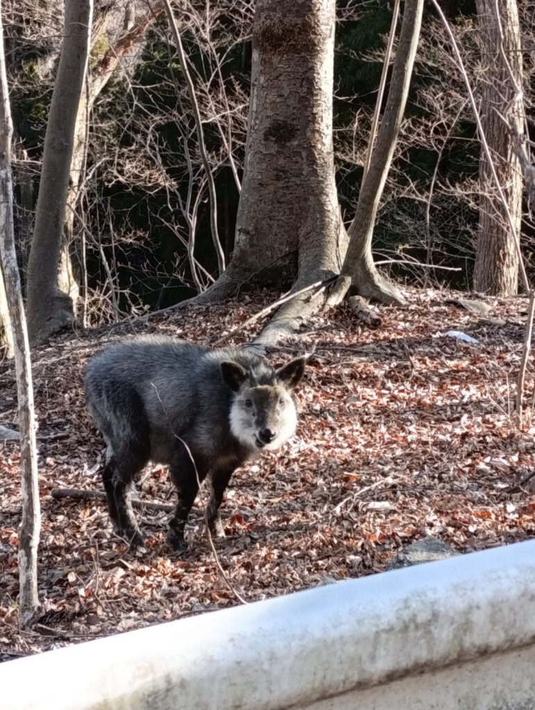 ガードレール越しに動物を発見。カモシカでした。いつもなら寒さで止まるどころではないのですが、今日はウィンドブレーカなしでも止まる余裕がありましたので、自転車を降りてカモシカに歩み寄ってみました。カモシカはよくジッと人間のほうを見て立ち止まっていることが多いのですが、こちらが驚かせるような急な動作をしなければ慌てて逃げるようなことはしません。まだ完全に成長しきっていないカモシカのようで、先日のライドで見かけたカモシカと同一個体だと感じました。大きさや雰囲気がとても良く似ていたのです。せっかくなので写真を撮らせてもらいました。