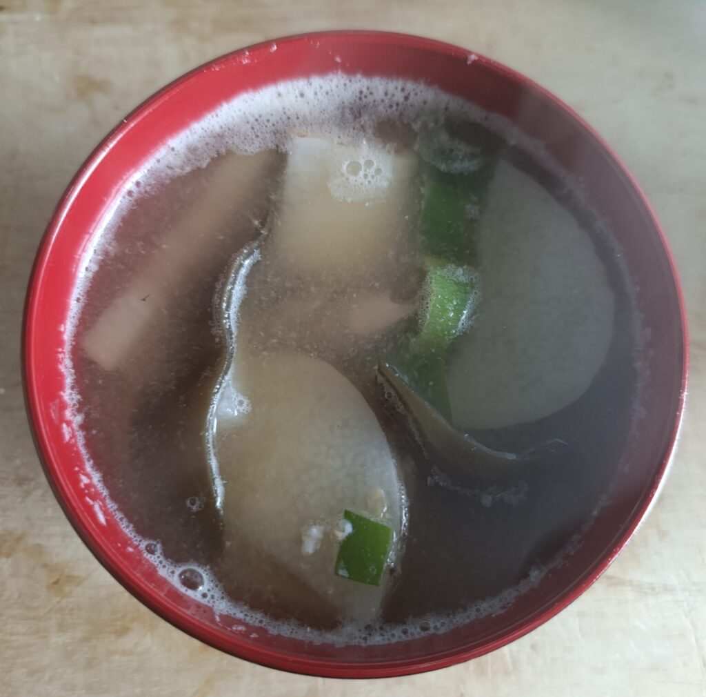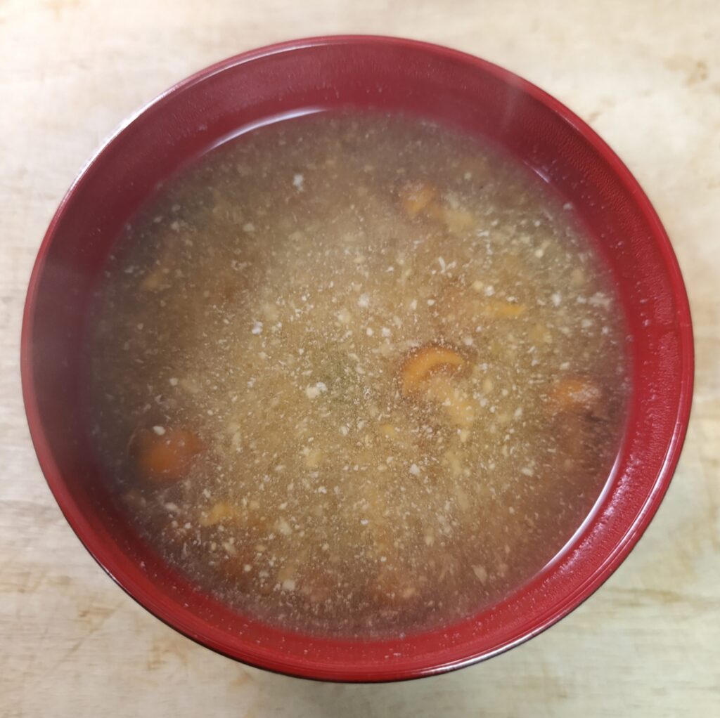 なめこそのものの味を活かしたいので、出汁用に入れるいつものいりこは敢えて使いません。味噌となめこだけでとてもおいしくいただけます。