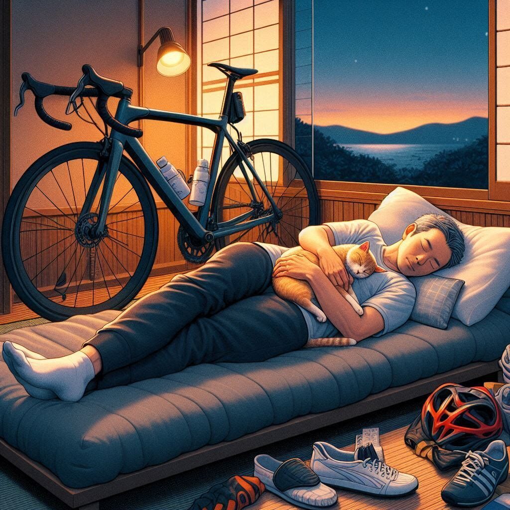 ロングライドや負荷の高いトレーニングを行った後は6時間程度の睡眠では疲労回復に不十分です。私はロングライドで疲労した後は9時間前後の睡眠をとるようにしています。とは言っても歳のせいかトイレに起きることが結構あるのですが・・・。もちろんただ長い時間寝ればよいというわけではなく、睡眠の質も重要です。しかし、ロングライドなどで高負荷の運動をする場合、「質」を確保するためにもまずは「量」を確保することが大前提だと考えたほうがよいと思います。