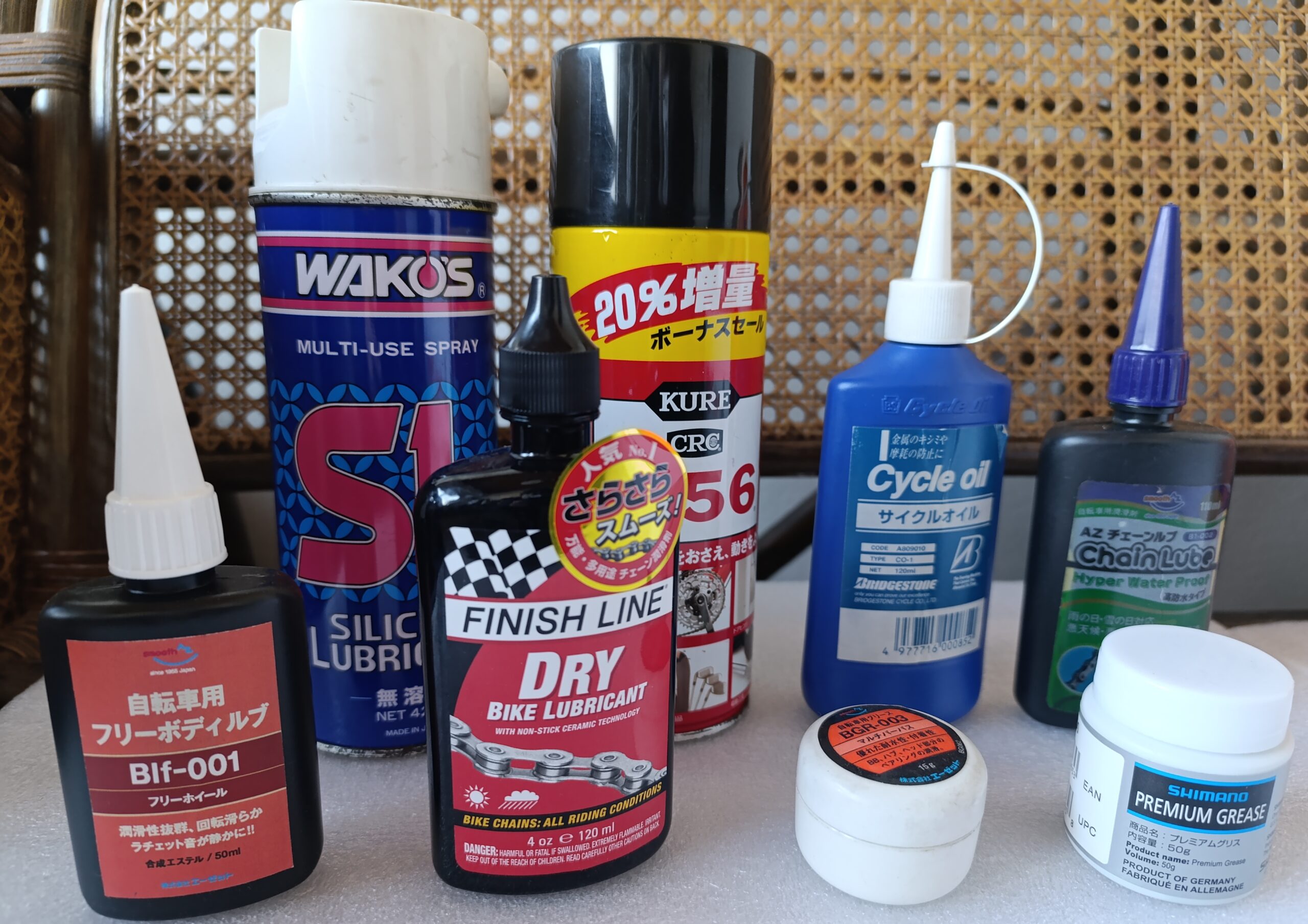 ワイヤーケーブルには潤滑剤として定番のKure-556を使っています。ごく一般的なものですがこれで十分だと思います。またコンポーンとの動作部やクリーニングした時の錆止めとしても使う時があります。和光やブリヂストンのオイルも同様の目的で使います。
